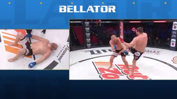 16일(한국 시간) 미국 코네티컷 언카스빌 모히건선아레나에서 열린 벨라토르 215 메인이벤트 헤비급 경기에서 맷 미트리온(40, 미국)의 킥을 낭심에 맞고 쓰러져 일어나지 못했다.