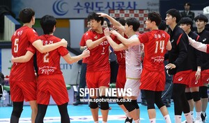 [스포티비뉴스=수원, 한희재 기자] 한국전력과 우리카드의 2018-2019 V리그 남자부 경기가 16일 오후 경기도 수원실내체육관에서 열렸다. 매치 포인트를 올린 한국전력 서재덕이 동료들의 축하를 받고 있다.