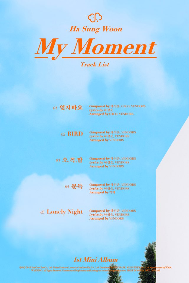 21일 오후 공개된 하성운의 첫 번째 솔로 미니앨범 '마이 모먼트' 트랙리스트에는 지난 1월에 발표한 ‘잊지마요’를 시작으로 총 5곡이 포함되어 있다.