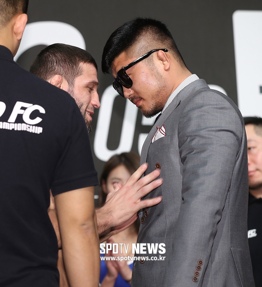 [스포티비뉴스=서울, 곽혜미 기자] 로드FC 052 계체량이 22일 오전 서울 서대문구 연희동 그랜드힐튼호텔에서 열렸다. 계체를 통과한 샤밀 자브로프를 권아솔이 도발하자 샤밀이 권아솔을 밀치고 있다.