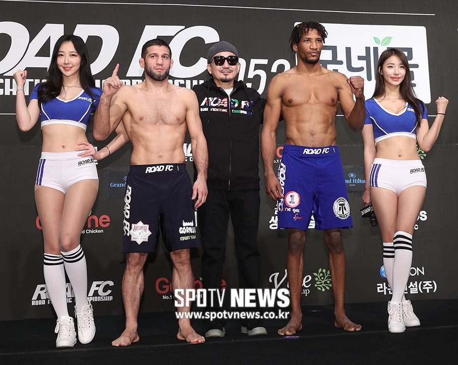 [스포티비뉴스=서울, 곽혜미 기자] 로드FC 052 계체량이 22일 오전 서울 서대문구 연희동 그랜드힐튼호텔에서 열렸다. 계체를 통과한 -70kg 라이트급 100만불 토너먼트 결승 샤밀 자브로프(왼쪽)와 만수르 바르나위가 포즈를 취하고 있다.