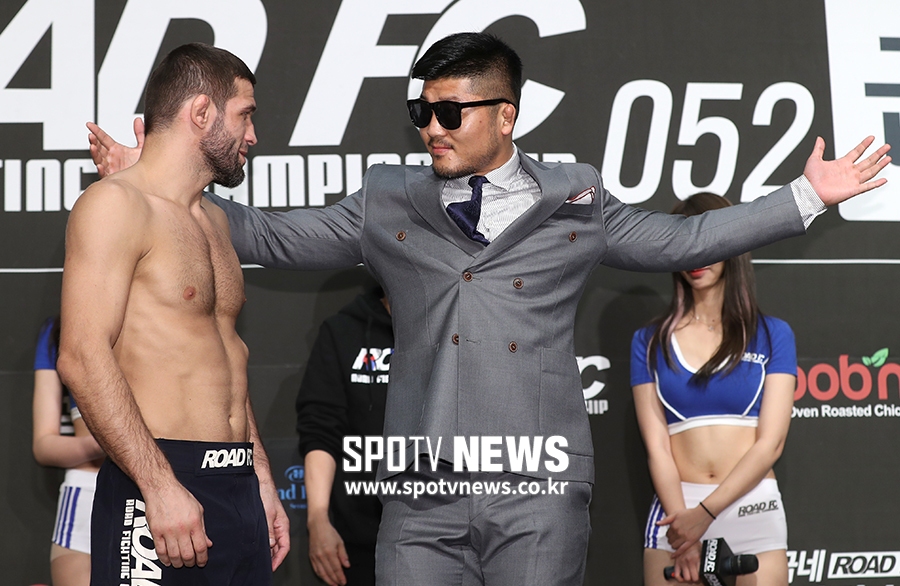 [스포티비뉴스=서울, 곽혜미 기자] 로드FC 052 계체량이 22일 오전 서울 서대문구 연희동 그랜드힐튼호텔에서 열렸다. 계체를 통과한 샤밀 자브로프(왼쪽)가 권아솔을 바라보고 있다.