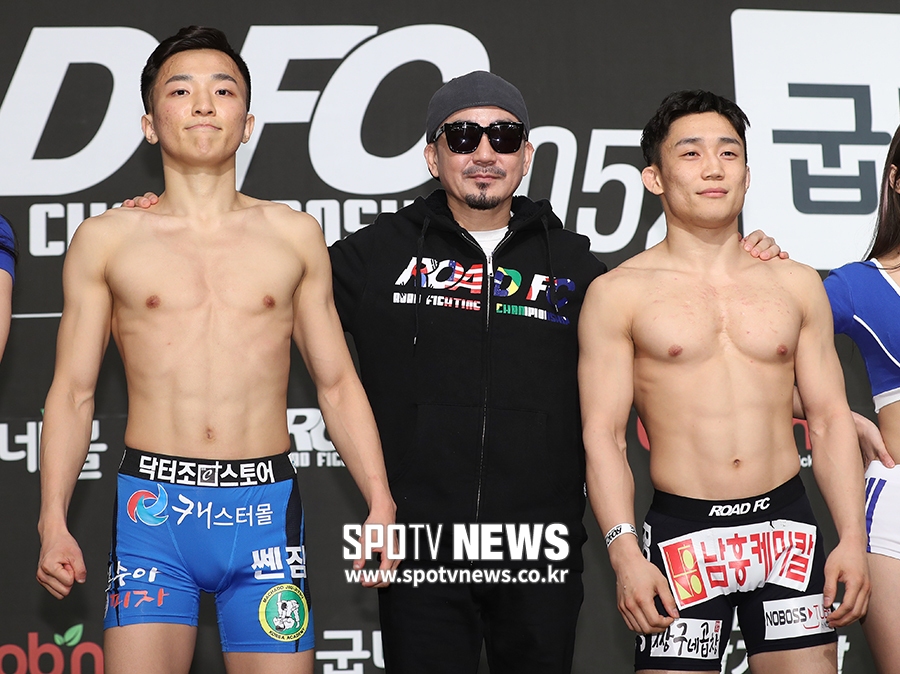 [스포티비뉴스=서울, 곽혜미 기자] 로드FC 052 계체량이 22일 오전 서울 서대문구 연희동 그랜드힐튼호텔에서 열렸다. 계체를 통과한 이정현(왼쪽)과 박수완이 포즈를 취하고 있다.