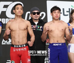 [스포티비뉴스=서울, 곽혜미 기자] 로드FC 052 계체량이 22일 오전 서울 서대문구 연희동 그랜드힐튼호텔에서 열렸다. 계체를 통과한 신승민(왼쪽), 정상진이 포즈를 취하고 있다.