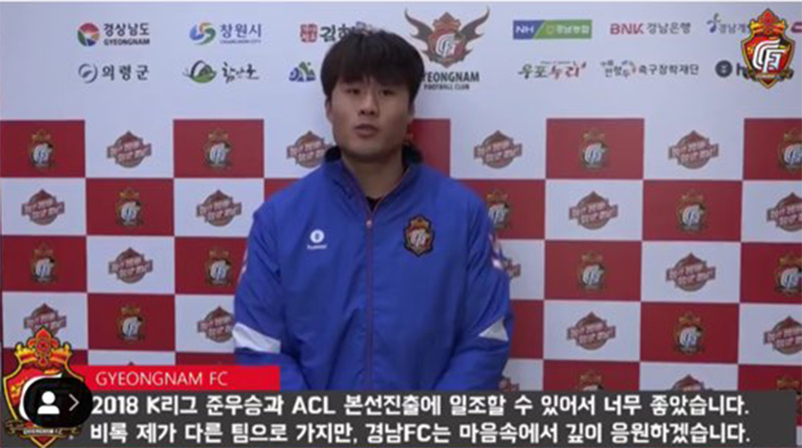 “경남FC에서 보낸 시간들은 제게 많은 영광을 안겨 주었습니다. 2017년 K리그2 우승, 2018년 ACL 진출과 리그 준우승까지. 모두 경남에서 이뤘습니다. 덕분에 국가 대표에도 뽑힐 수 있었습니다.”
