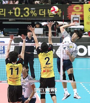 [스포티비뉴스=안산, 곽혜미 기자] 2018-2019 도드람 V리그 남자부 OK저축은행과 우리카드의 경기가 24일 오후 안산 상록수체육관에서 열렸다. 우리카드 한성정이 공격을 시도하고 있다.