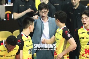[스포티비뉴스=안산, 곽혜미 기자] 2018-2019 도드람 V리그 남자부 OK저축은행과 우리카드의 경기가 24일 오후 안산 상록수체육관에서 열렸다. OK저축은행 김세진 감독이 작전 지시를 내리고 있다.