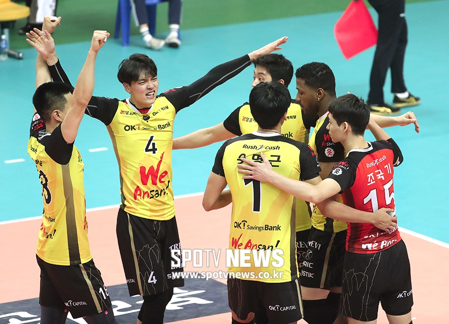 [스포티비뉴스=안산, 곽혜미 기자] 2018-2019 도드람 V리그 남자부 OK저축은행과 우리카드의 경기가 24일 오후 안산 상록수체육관에서 열렸다. 1세트 승리를 거둔 OK저축은행 선수들이 기뻐하고 있다.