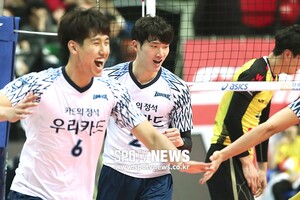 [스포티비뉴스=안산, 곽혜미 기자] 2018-2019 도드람 V리그 남자부 OK저축은행과 우리카드의 경기가 24일 오후 안산 상록수체육관에서 열렸다. 우리카드 황경민이 득점에 성공한 후 기뻐하고 있다.