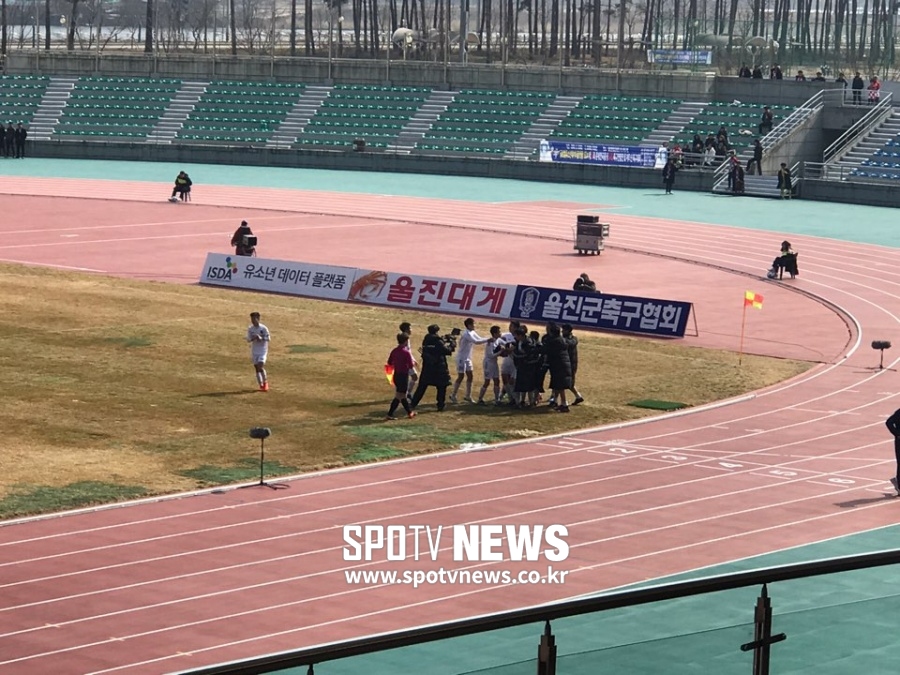 오전 11시 30분 울진종합운동장에서 목동중과 군포중이 만났다. 선제골은 목동중학교였다. 주장 이호연이 군포중 골망을 흔들었다. 군포중 진영에서 침착하게 골문으로 밀어 넣었다. 선제골 이후 목동중의 몸놀림이 더 가벼워졌다. 전방으로 끊임없이 쇄도하며 추가골을 노렸다.
