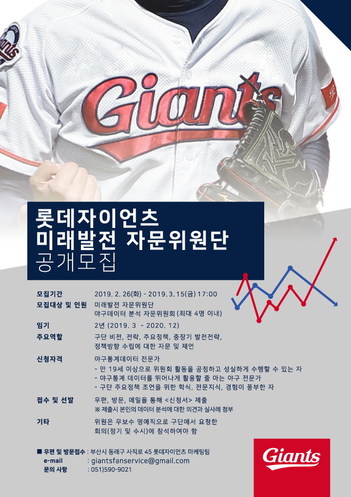 야구데이터 분석 자문위원 공개모집은 2월 26일(화)부터 3월 15일(금)까지 진행한다. 구단 홈페이지 게시판의 신청서와 함께 본인의 데이터 분석에 대한 의견과 실사례를 첨부해 우편 및 방문(부산시 동래구 사직로 45 사직야구장 마케팅팀) 또는 메일(giantsfanservice@gmail.com)로 접수하면 된다.