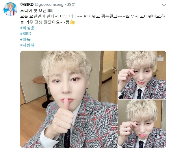 하성운은 지난달 28일 자신의 트위터 계정을 개설하고 “드디어 첫 오픈! 오늘 오랜만에 만나서 너무너무~~ 반가웠고 행복했고~~ 또 무지 고마웠어요. 하늘 너무 고생 많았어요~~짱 #하성운 #BIRD #하늘 #사랑해”라는 글과 함께 몇 장의 사진을 공개했다.