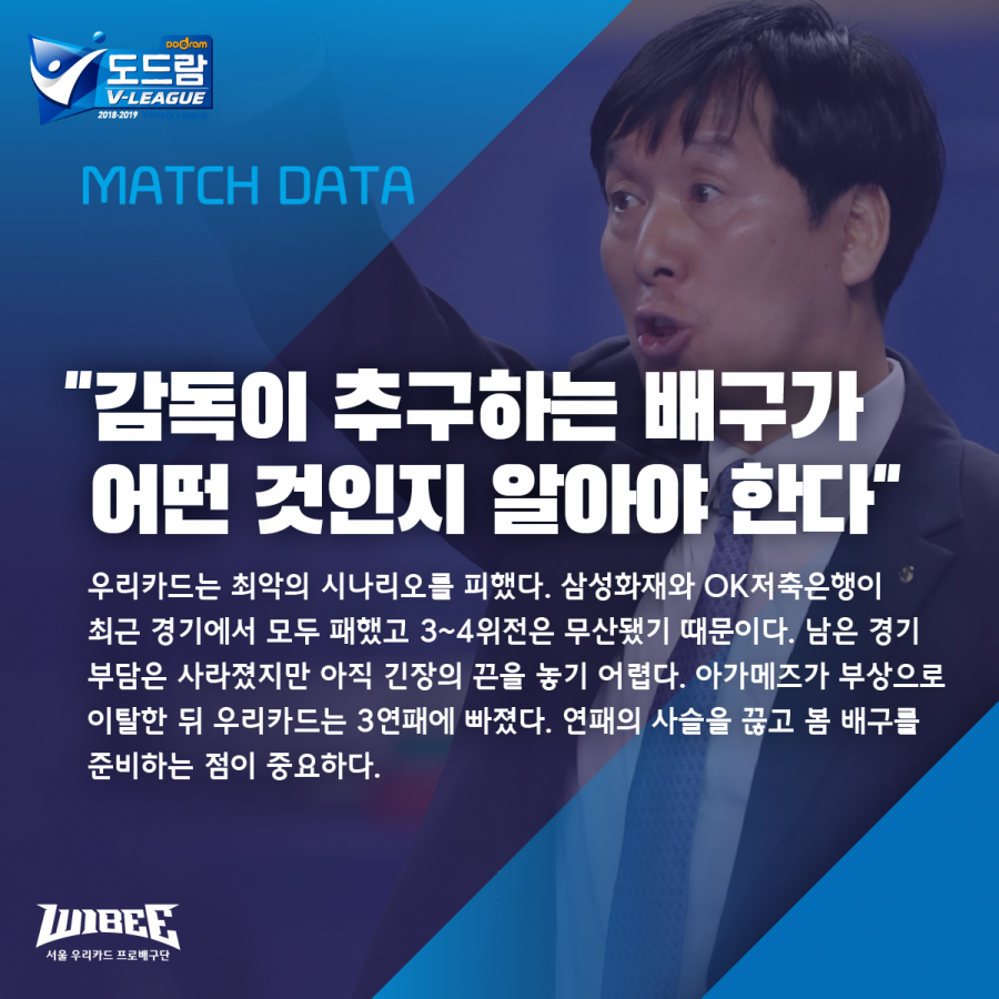그러나 연패를 끊고 플레이오프를 준비하는 점은 무엇보다 중요하다. 신영철 우리카드 감독은 "질 때 왜 그랬는지 선수들이 인지해야할 필요가 있다. 감독이 추구하는 배구가 무엇인지 알아야 한다"며 '생각하는 배구'를 강조했다.