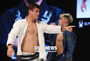 [스포티비뉴스=서울, 한희재 기자] 스파이더 BJJ 챔피언십이 2일 오후 서울 올림픽공원 K아트홀에서 열렸다. 76kg급 준결승, 리바이 존스(푸른 도복)를 꺾고 결스에 오른 오스발도 모이징뇨(흰색 도복)가 기뻐하고 있다.