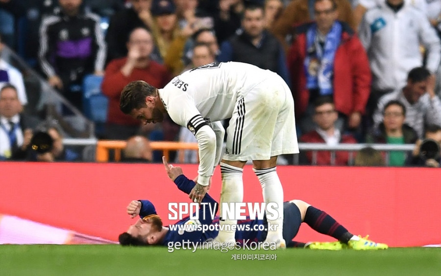 알고 보니 메시가 세르히오 라모스의 팔에 맞아 얼굴을 부여잡고 쓰러진 것이었다. 하지만, 레알 홈에서는 모든 것이 용납되지 않았다. 메시는 주심에게 억울함을 호소했고 라모스와 이마를 마주하며 으르렁거렸다. 그러자 더 큰 야유가 나왔다.