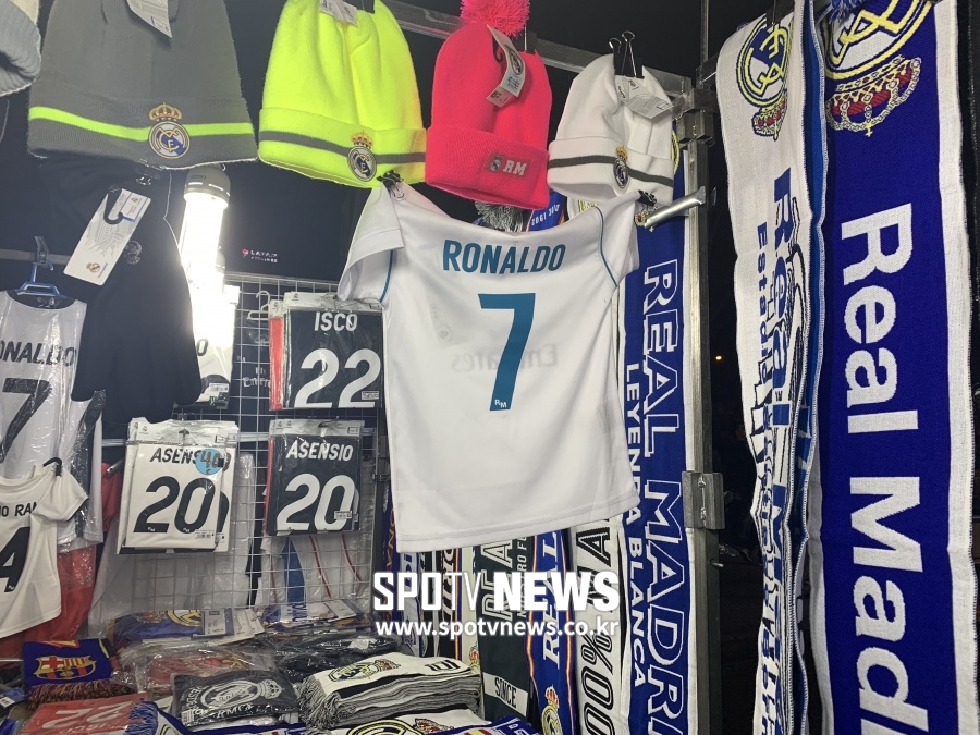 [스포티비뉴스=마드리드, 강경훈 통신원/ 한준 기자] FC바르셀로나와 레알 마드리드의 엘클라시코가 펼쳐진 현지 시간 2일 밤 산티아고 베르나베우 경기장 앞. 공식 스토어네는 유벤투스로 떠난 크리스티아누 호날두의 흔적이 없었지만, 팬들의 기호에 맞춘 머플러와 모조 유니폼을 파는 노점상에는 여전히 호날두가 인기였다.
