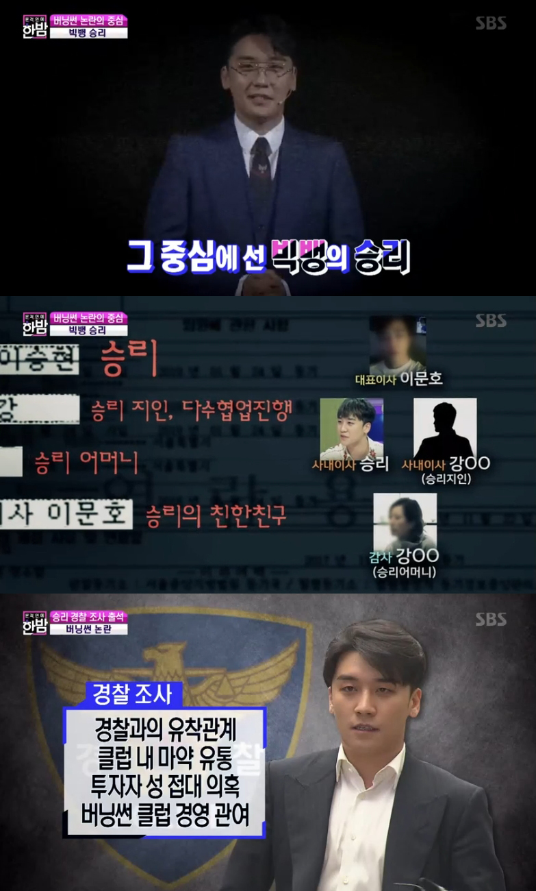 5일 방송된 SBS '본격연예한밤'에서는 '버닝썬' 사건으로 경찰청에 출두한 빅뱅 승리의 모습이 전파를 탔다.