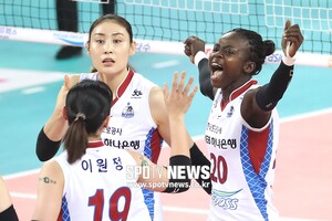 [스포티비뉴스=인천, 곽혜미 기자] 2018-2019 도드람 V리그 여자부 흥국생명과 한국도로공사의 경기가 6일 오후 인천 계양체육관에서 열렸다. 득점에 성공한 한국도로공사 파튜가 기뻐하고 있다.