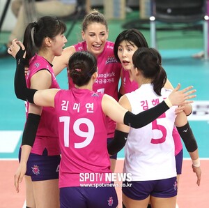 [스포티비뉴스=인천, 곽혜미 기자] 2018-2019 도드람 V리그 여자부 흥국생명과 한국도로공사의 경기가 6일 오후 인천 계양체육관에서 열렸다. 흥국생명 선수들이 득점에 기뻐하고 있다.
