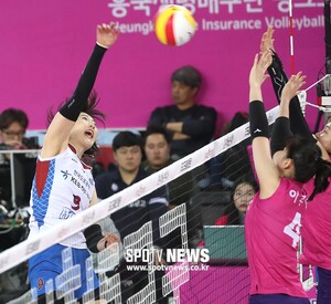 [스포티비뉴스=인천, 곽혜미 기자] 2018-2019 도드람 V리그 여자부 흥국생명과 한국도로공사의 경기가 6일 오후 인천 계양체육관에서 열렸다. 한국도로공사 박정아가 공격을 시도하고 있다.