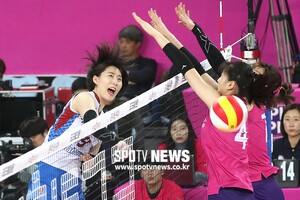 [스포티비뉴스=인천, 곽혜미 기자] 2018-2019 도드람 V리그 여자부 흥국생명과 한국도로공사의 경기가 6일 오후 인천 계양체육관에서 열렸다. 한국도로공사 박정아가 공격을 시도하고 있다.