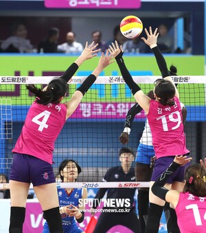 [스포티비뉴스=인천, 곽혜미 기자] 2018-2019 도드람 V리그 여자부 흥국생명과 한국도로공사의 경기가 6일 오후 인천 계양체육관에서 열렸다. 흥국생명 이주아와 김미연이 블로킹을 시도하고 있다.