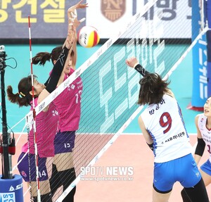 [스포티비뉴스=인천, 곽혜미 기자] 2018-2019 도드람 V리그 여자부 흥국생명과 한국도로공사의 경기가 6일 오후 인천 계양체육관에서 열렸다. 한국도로공사 박정아가 블로킹에 막히고 있다.
