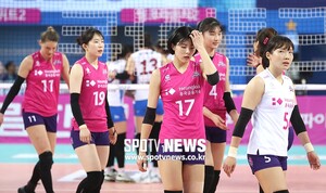 [스포티비뉴스=인천, 곽혜미 기자] 2018-2019 도드람 V리그 여자부 흥국생명과 한국도로공사의 경기가 6일 오후 인천 계양체육관에서 열렸다. 1세트 패배한 흥국생명 선수들이 아쉬워하고 있다.