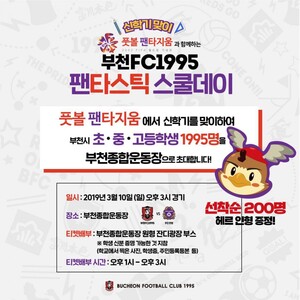 ‘팬타스틱 스쿨 데이’는 신학기를 맞아 부천FC1995와 풋볼 팬타지움이 함께 준비한 이벤트다. 부천의 초·중·고등학교 학생 1,995명을 초청한다. 경기 당일 학생 신분을 증명할 수 있는 신분증이나 교복 착용, 학교에서 촬영한 사진 등을 제시하면 풋볼 팬타지움에서 제공하는 부천FC1995의 홈경기 입장권을 받을 수 있다. 학생 입장객 선착순 200명을 대상으로 부천FC1995 마스코트인 헤르 인형을 선물로 증정한다.