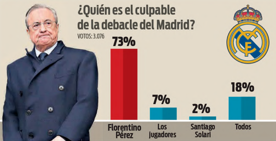아직 시즌이 끝나지 않았지만, 스페인 현지에선 레알의 '폭망' 시즌에 대한 논의가 이루어지고 있다. 현지 언론 매체의 조사에 따르면 압도적인 인원이 레알의 부진한 시즌의 책임자로 플로렌티노 페레스 회장이 지목됐다.