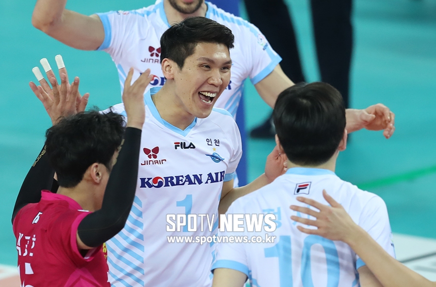 [스포티비뉴스=인천, 한희재 기자] 대한항공과 우리카드의 2018-2019 도드람 V리그 남자부 경기가 7일 오후 인천 계양체육관에서 열렸다. 득점을 올린 대한항공 김규민이 기뻐하고 있다.