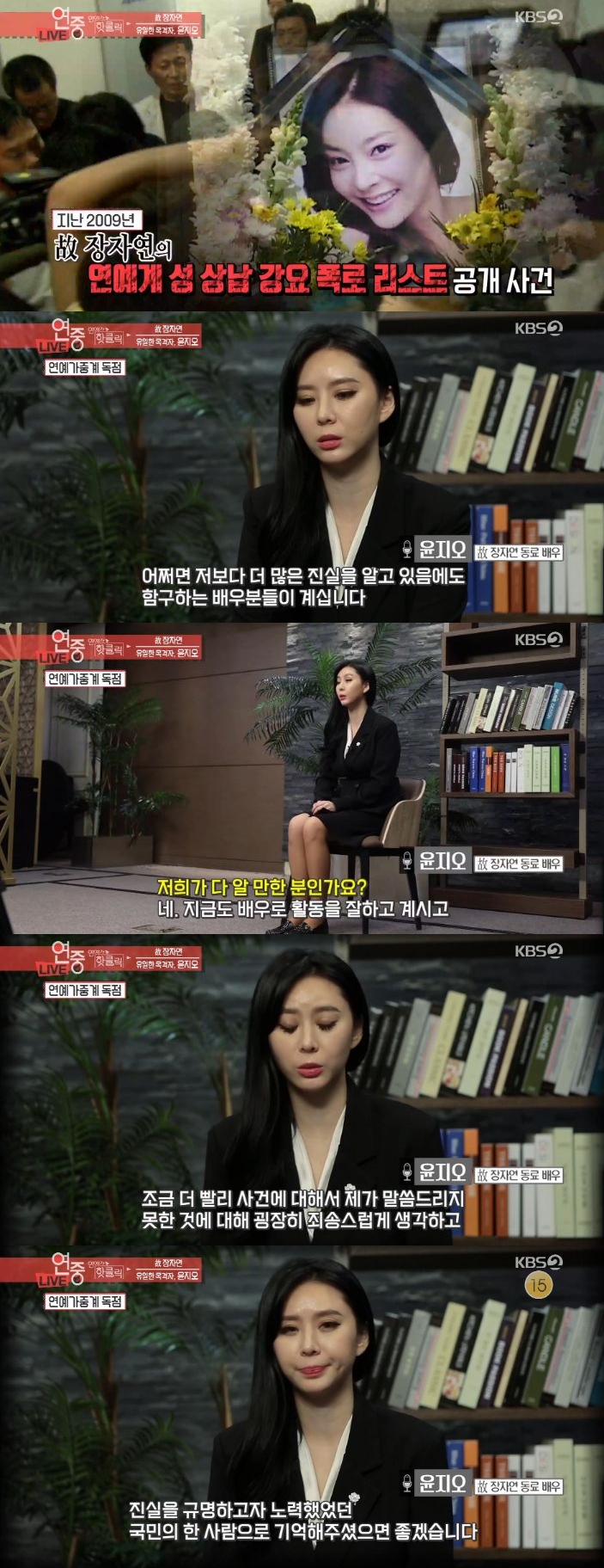 8일 방송된 KBS 2TV '연예가중계'에서는 윤지오의 인터뷰가 전파를 탔다. 윤지오는 카메라 앞에 서서 "장자연과 같은 기획사에서 같이 배우생활을 했던 윤지오다"라고 인사했다.