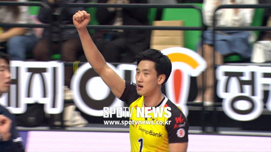 3세트에도 OK저축은행의 기세는 무서웠습니다. 전병선, 송명근, 차지환이 차례로 득점을 올리며 20점에 도달했는데요. 송명근의 득점으로 매치포인트를 만든 뒤 이승준이 경기를 끝냈습니다.