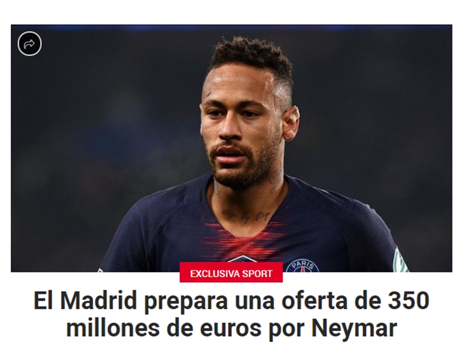 스페인 스포츠 신문 '스포르트'는 9일 "레알이 네이마르를 위해 3억 5000만 유로(약 4470억 원)의 제안을 할 준비를 하고 있다"고 보도했다. 파리생제르맹(PSG)로 떠나면서 기록한 2억 2200만 유로(약 2800억 원)를 훌쩍 뛰어넘는 역대 '최고'다. 네이마르의 경우 바이아웃 조항이 없다.