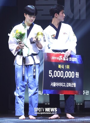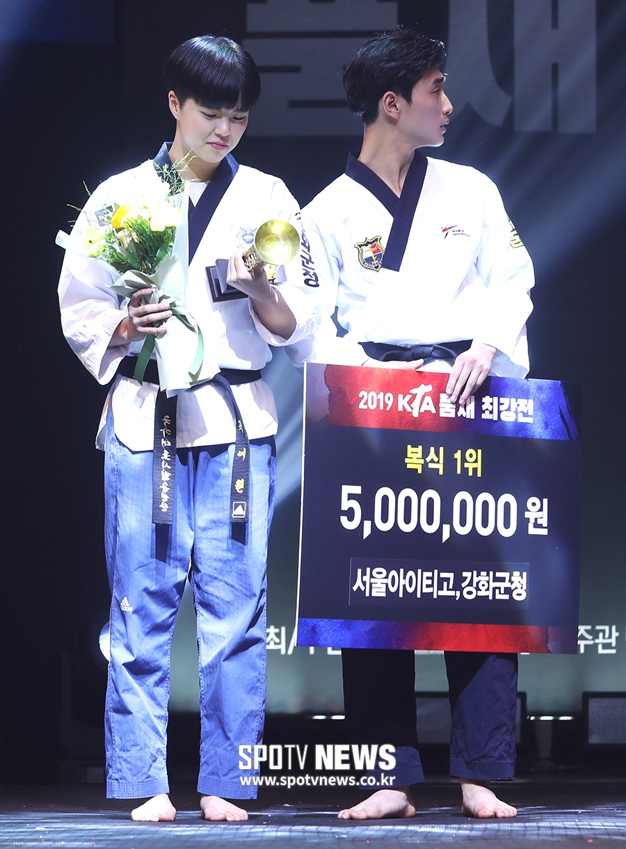 [스포티비뉴스=서울, 곽혜미 기자] 2019 KTA 품새 최강전이 9일 오후 서울 송파구 올림픽공원 K아트홀에서 열렸다. 복식 1위를 차지한 윤규성과 곽여원이 트로피를 바라보고 있다.
