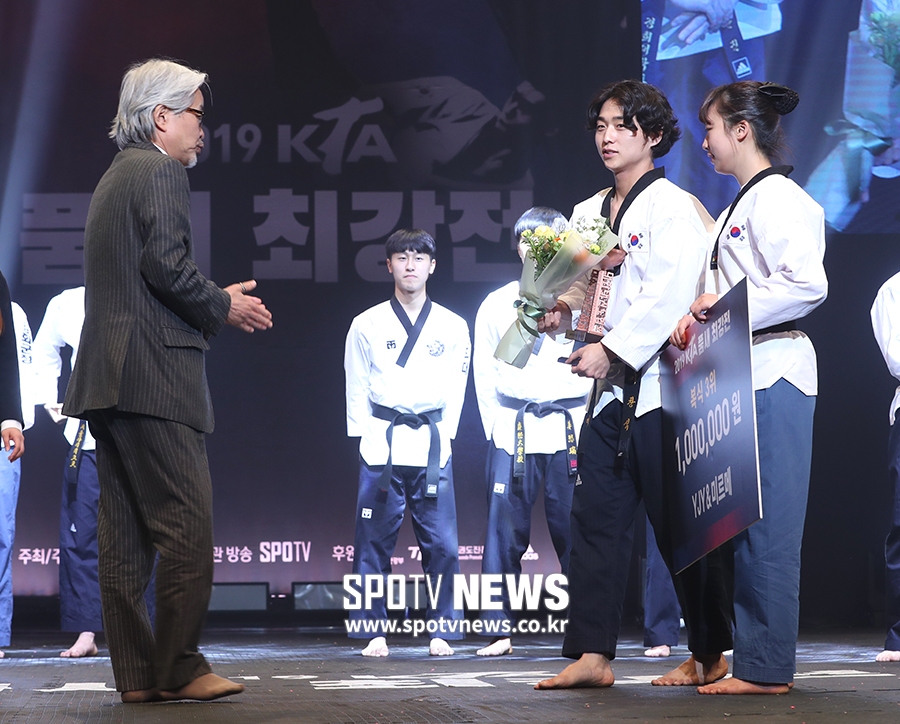[스포티비뉴스=서울, 곽혜미 기자] 2019 KTA 품새 최강전이 9일 오후 서울 송파구 올림픽공원 K아트홀에서 열렸다. 복식 3위를 차지한 YJY&미르메 이창식과 이지영이 트로피를 받고 있다.