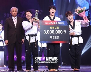 [스포티비뉴스=서울, 곽혜미 기자] 2019 KTA 품새 최강전이 9일 오후 서울 송파구 올림픽공원 K아트홀에서 열렸다. 단체전 2위를 차지한 태권한류팀 한영훈, 류현식, 권영인이 포즈를 취하고 있다.