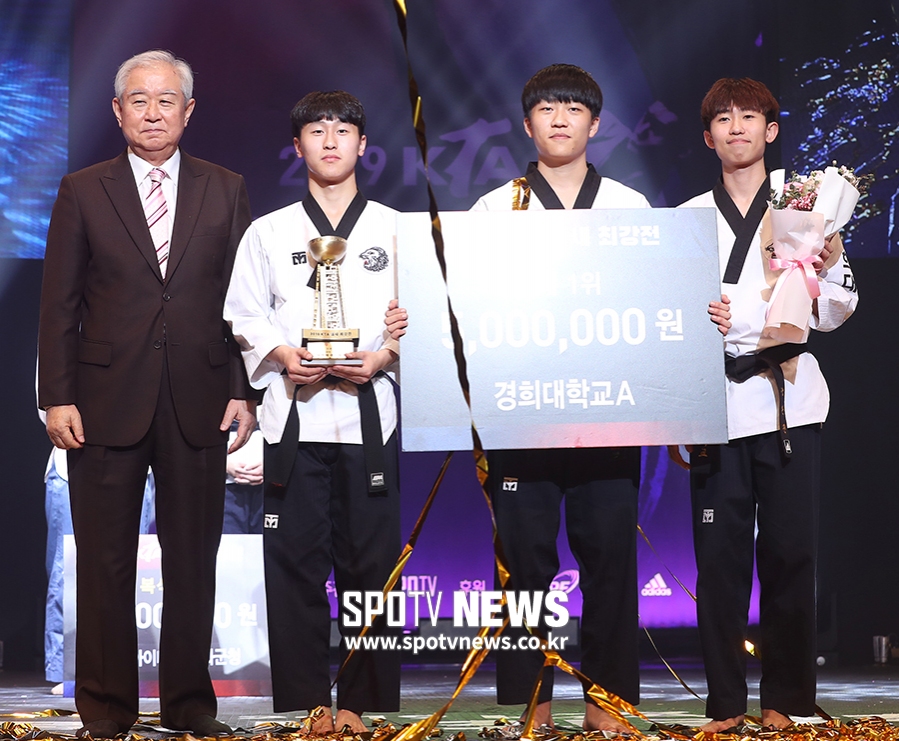 [스포티비뉴스=서울, 곽혜미 기자] 2019 KTA 품새 최강전이 9일 오후 서울 송파구 올림픽공원 K아트홀에서 열렸다. 단체전 1위를 차지한 경희대학교 임승진, 강민서, 강완진이 기념 촬영을 하고 있다.