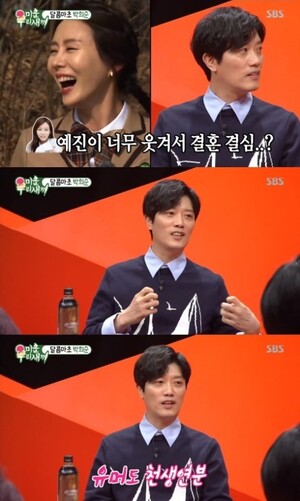 이어 "예전부터 바라던 결혼 상대가 유머 코드가 맞는사람"이라며 "다른 사람들은 아무도 안 웃는데 우리 둘만 아는 공감대가 있는 사람이었으면 좋겠다고 했는데 (박예진) 그 분이 그렇다"고 말했다.