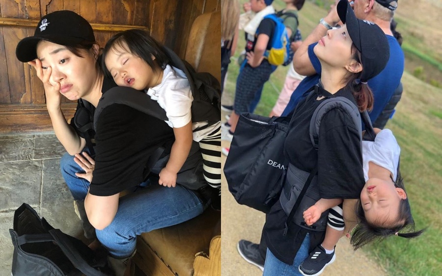 사진 속 허민은 피곤한 모습으로 딸을 안고 있거나 달래고 있다. 딸 또한 울거나 자고 있어 힘들었던 여행을 엿볼 수 있다.