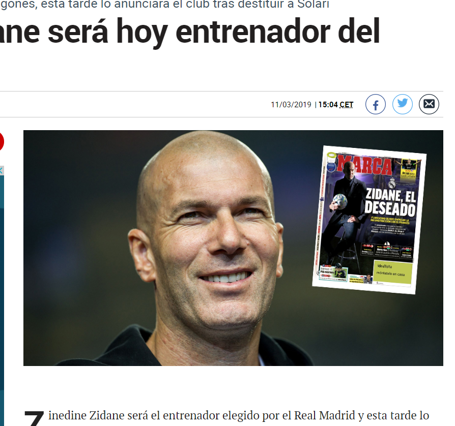후고네스는 구체적으로 스페인 시간으로 11일 오후 6시에 레알 마드리드가 지단 선임을 공식 발표할 것이라고 알렸다. 마르카도 레알 마드리드가 11일 오후에 지단 선임을 발표하고 12일부터 훈련 지휘에 나설 것이라고 썼다.