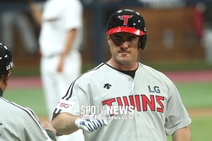 [스포티비뉴스=고척, 곽혜미 기자] 2019 KBO 리그 시범 경기 키움 히어로즈와 LG 트윈스의 경기가 12일 오후 서울 구로구 고척스카이돔에서 열렸다. 4회초 선두타자로 나선 LG 조셉이 볼넷으로 출루한 후 김호 코치와 하이파이브를 하고 있다.