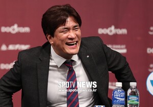 [스포티비뉴스=서울, 한희재 기자] 2018-2019 도드람 V리그 포스트시즌 미디어데이 행사가 12일 오후 서울 강남구 리베라호텔에서 열렸다. GS칼텍스 차상현 감독이 친구인 도로공사 김종민 감독의 농담에 크게 웃고 있다.
