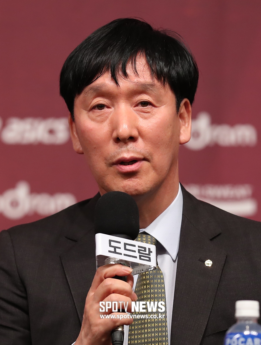 [스포티비뉴스=서울, 한희재 기자] 2018-2019 도드람 V리그 포스트시즌 미디어데이 행사가 12일 오후 서울 강남구 리베라호텔에서 열렸다. 우리카드를 창단 첫 포스트시즌으로 이끈 신영철 감독이 인사하고 있다.