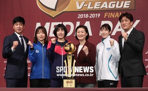 [스포티비뉴스=서울, 한희재 기자] 2018-2019 도드람 V리그 포스트시즌 미디어데이 행사가 12일 오후 서울 강남구 리베라호텔에서 열렸다. 도로공사 김종민 감독, 문정원, 흥국생명 이재영, 박미희 감독, GS칼텍스 이소영, 차상현 감독(왼쪽부터)이 우승 트로피 앞에서 포즈를 취하고 있다.