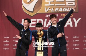 [스포티비뉴스=서울, 한희재 기자] 2018-2019 도드람 V리그 포스트시즌 미디어데이 행사가 12일 오후 서울 강남구 리베라호텔에서 열렸다. 우승 트로피 앞에 선 현대캐피탈 전광인, 대한항공 정지석, 우리카드 나경복(왼쪽부터)이 포즈를 취하고 있다.