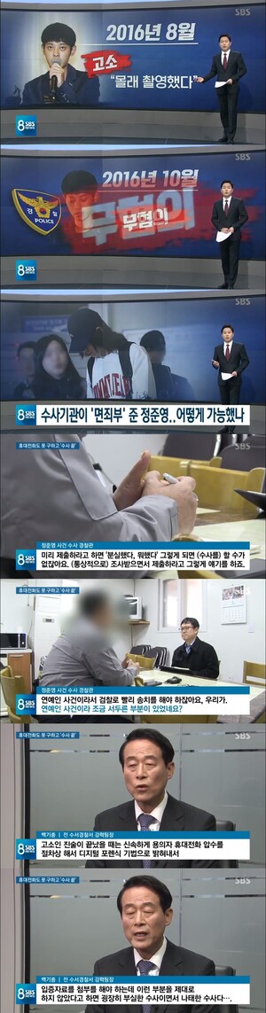 12일 방송된 'SBS 뉴스8'은 11일에 이어 성관계 영상 불법 촬영 및 유포 혐의로 입건된 가수 정준영과 지인들의 카카오톡 단체방 대화 관련 소식을 다뤘다. 이어 2016년 8월 전 여자친구의 성관계 영상 및 사진을 동의없이 촬영해 피소됐던 정준영의 과거 사건의 부실 수사 정황을 짚었다.