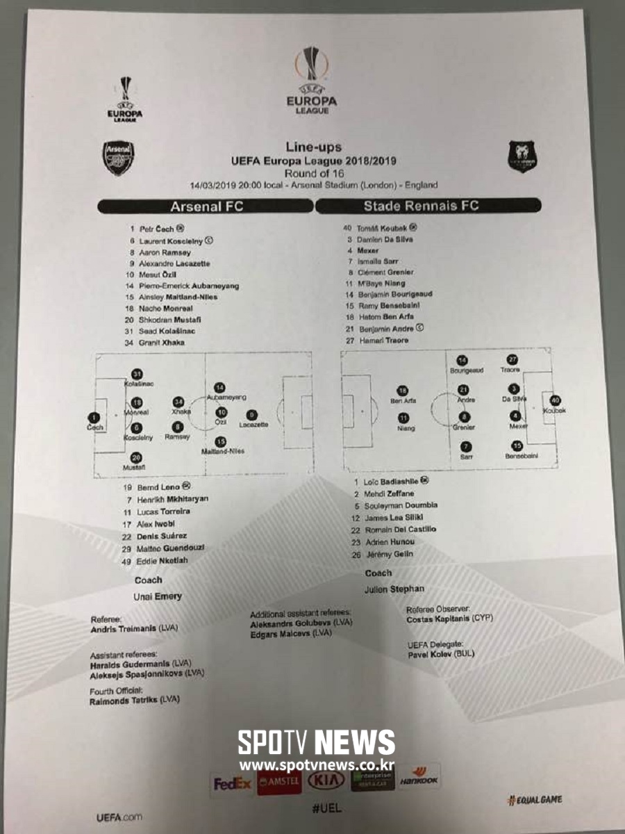 아스널은 15일 오전 5시(한국 시간) 영국 런던의 에미레이츠 스타디움에서 열린 2018-19시즌 유럽축구연맹(UEFA) 유로파리그 16강 2차전 스타드 렌과 경기에서 3-0으로 이겼다. 1, 2차전 합계 4-3으로 아스널이 8강에 올랐다.