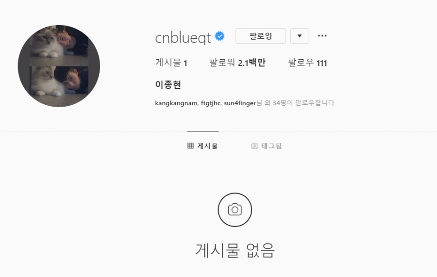 [스포티비뉴스=강효진 기자] 씨엔블루 이종현이 '정준영 단톡방' 멤버로 밝혀진 이후 SNS 계정 게시물을 전부 삭제하는 행동으로 눈길을 끈다.
