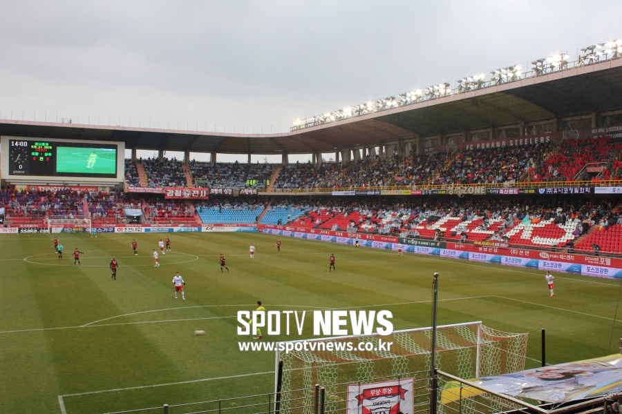 원정석이지만 스틸야드의 몰입감은 여전하다. 하루 전 대구FC의 새로운 경기장처럼 알루미늄 바닥이 없어서 발을 구를 순 없지만 다른 장점은 있다. 스틸야드의 피치는 출입구보다 약간 높다. 경기장으로 들어가면서 선수들이 움직이는 게 보인다. 마치 소설 해리포터에 나오는 9와 3/4 승강장처럼 축구의 세계로 빠져드는 기분이다. 관중석의 몰입감도 좋다. 1,2층으로 나뉘어 피치를 향해 쏟아지는 듯해 경기에 빠져들 수 있다.